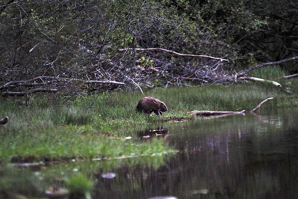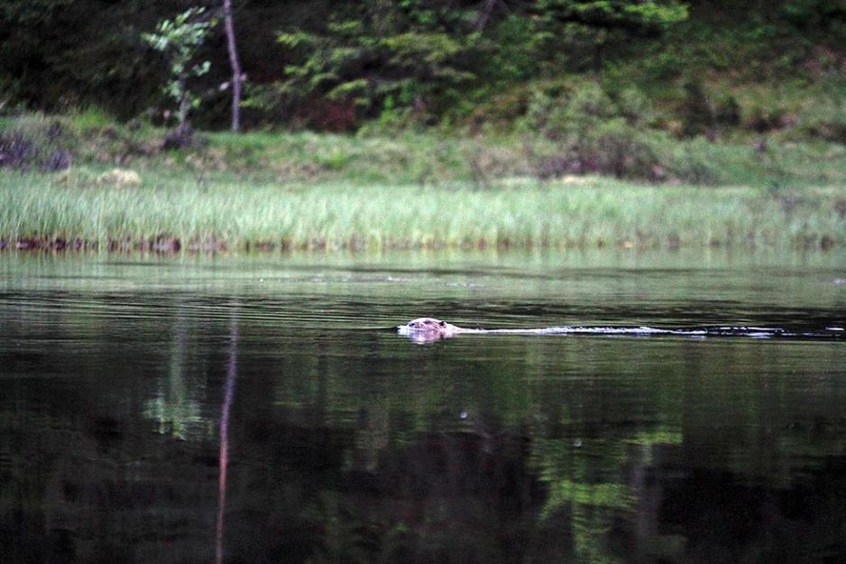 Vi er åtte store og små som lusker oss ned mot vannet, noen har skimtet et svømmende dyr mellom trærne. Utrolig nok klarer hele gjengen å komme seg ned uten å skremme vekk hele nabolaget. Og her venter et spennende møte med en bever. Vi ser den tydelig der den rolig svømmer forbi der vi sitter. Så krabber den opp på land, og steller pelsen. Plutselig dukker det opp én og så to andre bevere. Vi kan se ørene stikke opp når de svømmer rundt. De er tydelig på vakt hele tiden.