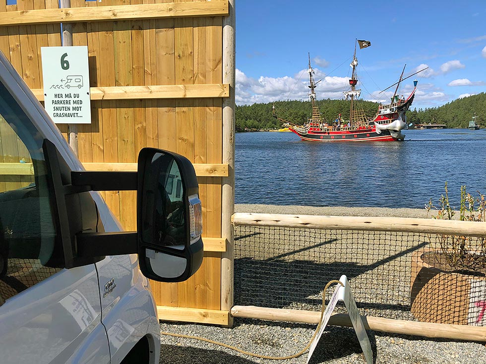 Vi har parkert bobilen i første rekke mot vannet, og jeg rekker knapt å dra i håndbrekket før et sjørøverskip siger mot oss.