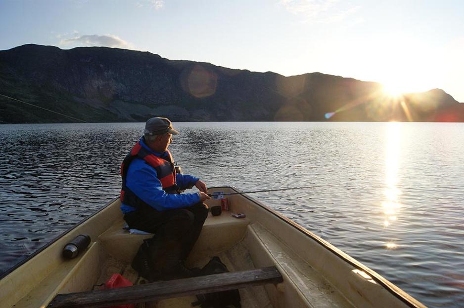Så det er ingen grunn til å legge seg for å sove nå, det kan vi gjøre senere, når fisken også sover. Vi har uansett kommet oss opp i overtrøtt tilstand, og er skikkelig gira på å komme i gang. Klokka er rundt halv fire på morgenen, den lille båten som ligger her hele året, har fått påhengsmotoren sin på, og vi skal sveive inn feriens første ørret.