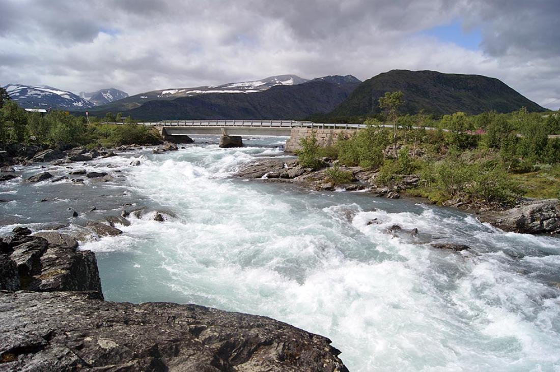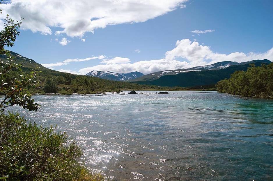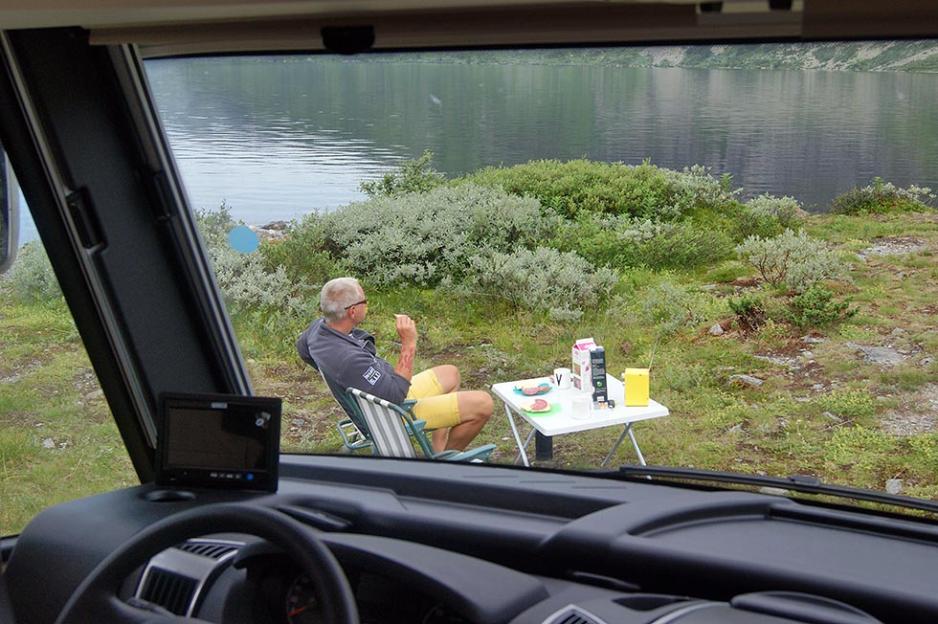 Så i en drøm av en bobil, la vi mil etter mil bak oss, skikkelig sugne på ferie og fjelltur. Mange av milene trillet vi dessuten på asfalt som var nylagt siden sist, og landskapet blir vakrere og vakrere jo nærmere målet vi kommer. Turen opp gikk som en lek, og plutselig ligger det der, vårt drømmested. Fjell og vann - og akkurat nok plass til oss og bobilen helt nede ved vannet.