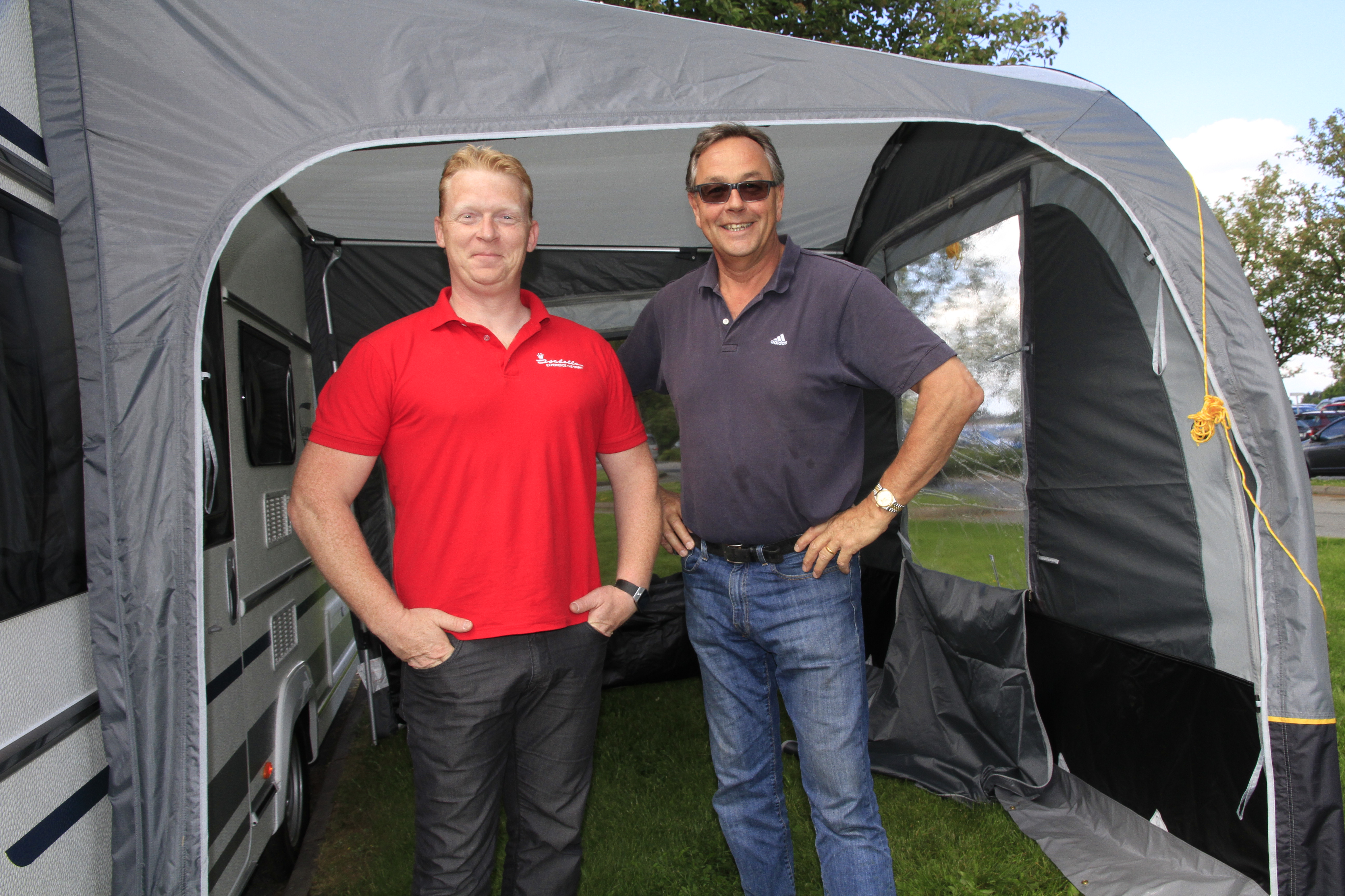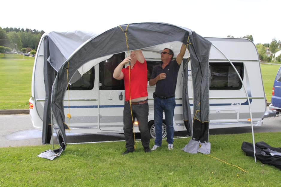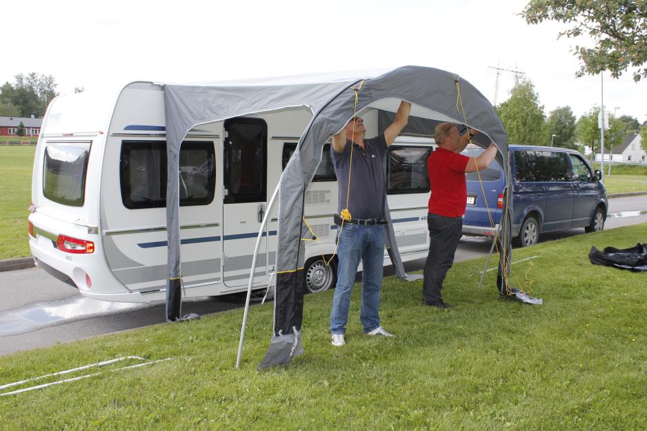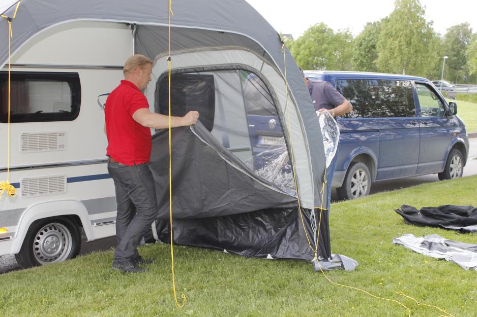 Sammen reiser vi til nabo Perry Caravan for å hente en Fendt kjørevogn, og så finner vi oss en gressplen hvor vi kjører inntil. – Du trenger ikke parkere vogna på gress selv om forteltet bør settes opp på mykt underlag, og det er heller ikke noe problem at det er høydeforskjell på vogna og teltet - slik som her, forteller Andersen. Han argumenterer med at teleskopstengene uansett vil kunne tilpasses, og viser i demonstrasjonen at det stemmer bra.