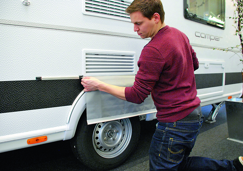 Innfestingen er skruefri, så du slipper å lage hull og å få utett vogn. Hjultildekningen fås i breddene 150 eller 75 cm og kan justeres i høyden. Den monteres med en skinne på siden av campingvognen med dobbeltsidig tape. Heretter settes stoffet i skinnen og hjultildekningen er montert. Hvis det er nødvendig kan skinnen forkortes. Skinnen er framstilt i aluminium med endepropper i sort plast og stoff i grå PVC.