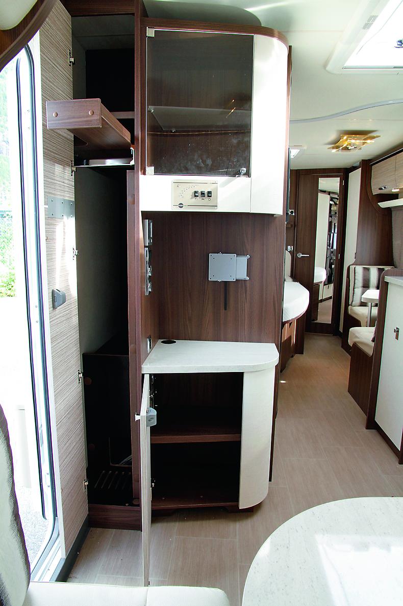 Vi har også sjekket taket, som er uten skjøter og ser ut til å ha gode muligheter for å unngå vann-ansamlinger. Like fornøyd er vi ikke når vi kikker under vognen og ser at det er en del ledninger som går på undersiden av vognen - uten beskyttelse. Hvordan disse vil se ut etter en del års bruk med steinsprut og fysisk tøft miljø er vi spent på. Bürstner har brukt korteste vei for å trekke vannledningene fra bad til kjøkken, noe som vil si under gulvet. Rørene er isolerte, om de også har elvarme klarte vi ikke å bringe på det rene før vi gikk i trykken. Andre produsenter har valgt å konsekvent trekke vannet innvendig. En bedre, men også dyrere løsning som man finner på premium-modeller.