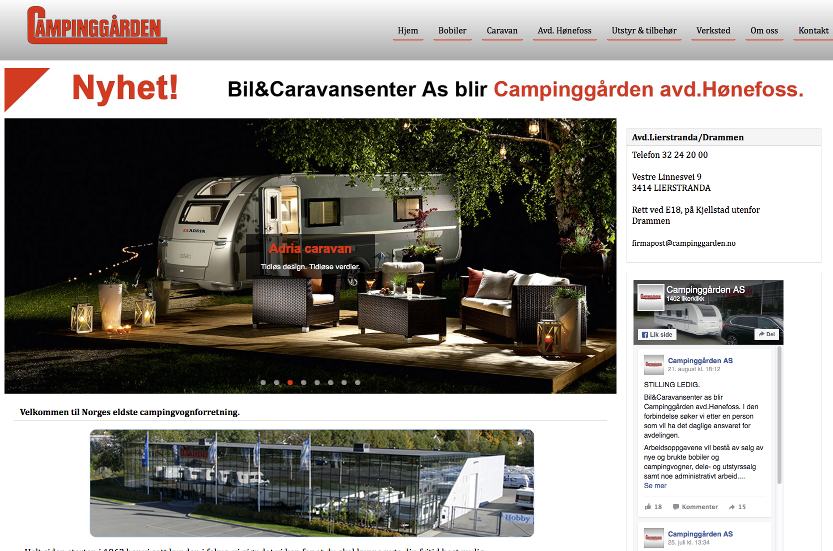 Forhandleren Bil & Caravansenter as på Hønefoss ble i høst overtatt av Campinggården i Drammen. Terje Thomte, som har eid og drevet selskapet fra oppstarten blir med videre på satsingen som vil hete Campinggården avdeling Hønefoss. Campinggården er Norges eldste forhandler og vil begynne å selge Hobby i Hønefoss.
