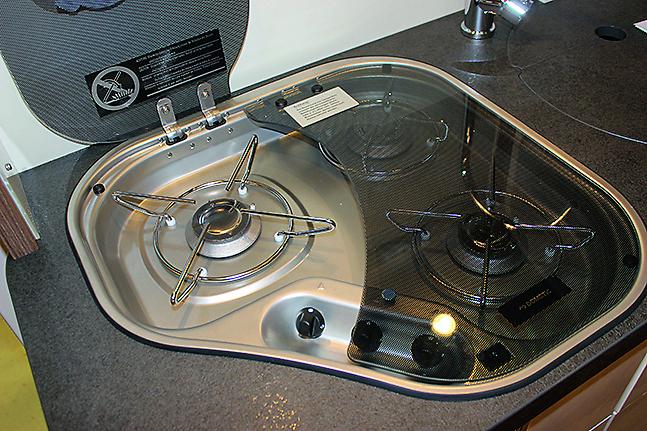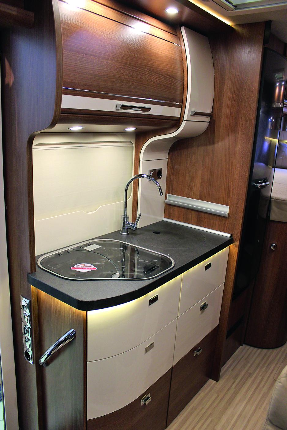 For øvrig har benken seks romslige skuffer, hvorav fire dype. Sammen med overskapet er det bra med oppbevaringsplass. På høyre side av benken står kjøleskapet fra Dometic, et smalt skap av typen RML 9335 med AES. I brosjyren står det at overskapet er forberedt for avtrekksvifte, men dette var vanskelig å oppdage. Her må luftevindu og takluke gjøre jobben. For øvrig blir benken bra belyst av spotter i taket og under overskapet. En kompakt kjøkkenbenk som gjør en bra jobb.