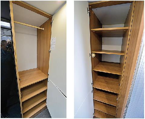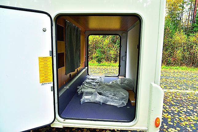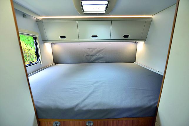 Det er generøst med lastekapasitet om bord. Garasjen er stor, og har like store luker på begge sider. Det er ingen selvfølge, selv i langt dyrere modeller. Overskapene har stort volum og rommer mye, om man utnytter dem maksimalt. Det som imponerer mest er derimot garderobeskapene: To stykk i full høyde finnes i bilen, i tillegg et mindre under sengen.