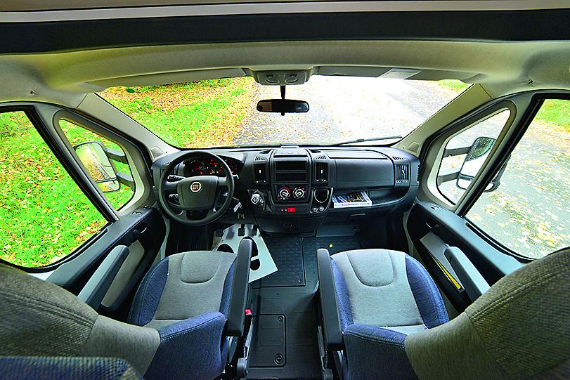 Det første jeg noterer meg er at jeg sitter mer behagelig enn normalt. Ikke på grunn av at Sun Living har valgt en mer komfortabel stol - det er en Fiat original. Den økte komforten kommer av at stolen er lavere enn normalt siden den ikke er vendbar. Snurreplaten bygger rundt fem centimeter, og utgjør en klar forskjell - spesielt for de som er over gjennomsnittshøyden.