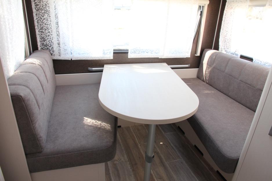 Det er en klassisk løsning innvendig, med sittegruppen bakerst, bad og kjøkken overfor hverandre og to separate senger. Bordet er skråstilt, og det samme er de to sittebenkene, som rommer to-tre personer. Dette er en vogn for to personer, og normal bruk tilsier at man sitter i hver sin sofa. Bra med overskap, og åpen lagringsplass i hjørnene. Lagringsplass under sofaene, og overskap hele veien bak til senga gir mer enn nok muligheter for å få med seg alt man ønsker. Under den smaleste sofaen er vanntanken på 44 liter plassert. Vær forberedt på at du må fjerne putene for å få adgang til plassen under sofaene - det finnes bedre løsninger på markedet ...