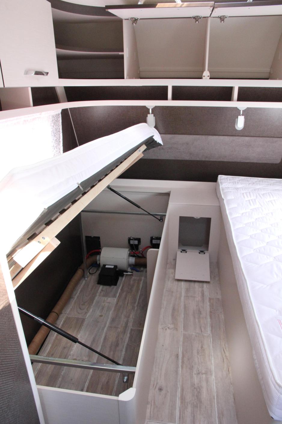 En løsning denne modellen skiller seg spesielt positivt ut er løsningen rundt sengene og lagerplassen under disse. Sengene er forholdsvis høye, uten at det er påfallende. Gangen mellom disse består av en kasse for å få riktig høyde når du skal opp i sengen. Og under dette området er det lagringsplass i hele vognens bredde. Legg til at begge sengene kan vippes opp for lett adkomst, og ikke minst: En stor utvendig luke som gir deg tilgang til hele området. En veldig god løsning!