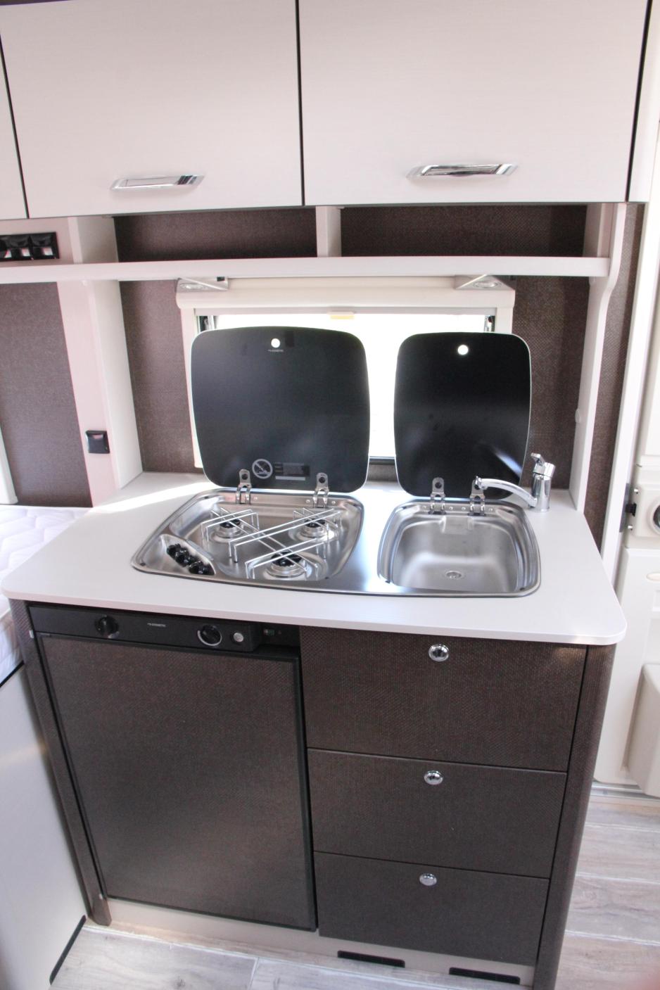 På kjøkkenet finner vi tre bluss og vask, samt et 80 liters kjøleskap av typen Dometic RMS8500. De to overskapsdørene har en forsterket lås sammenlignet med de andre skapdørene for å sikre innholdet. Det er ikke spesielt god arbeidsplass på benken, men både koketopp og vask har lokk som frigjør mye plass når de ikke er i bruk. Det er lite skapplass under benken, hvor kjøleskapet er plassert. Men i en vogn som har så mange lagringsmuligheter som denne bør det ikke være vanskelig å finne en fungerende løsning.