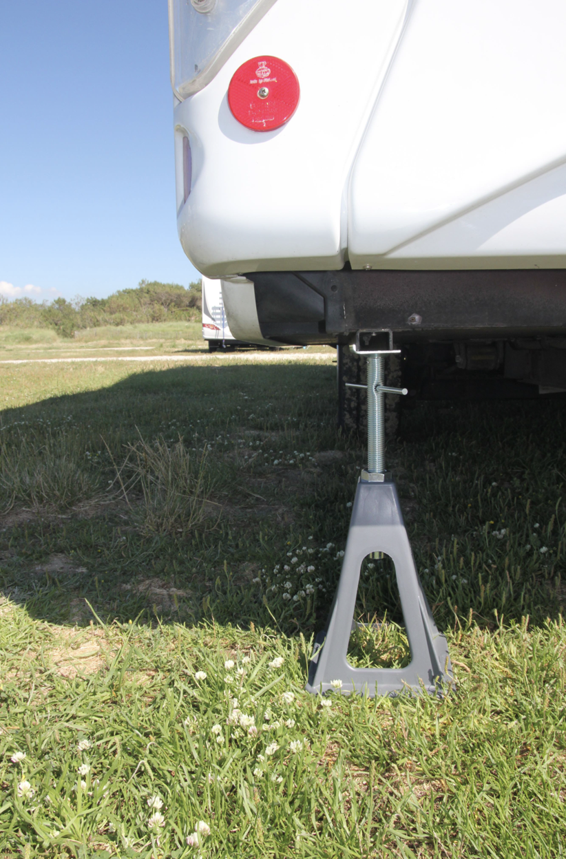 Du kan selvsagt gå for gull, og velge et hydraulisk drevet støttebeinsystem som automatisk kan posisjonere bilen i vater. Det finnes gode løsninger fra blant andre E&P Hydraulics og AL-KO, men de koster - og de veier en del. Langt enklere og rimeligere er støttebukker. Du kan spanderer du på deg fire av disse for godt under tusenlappen. Typisk maksimal belastning er 1000 kg per bukk, og det bør holde for de fleste bobiler..