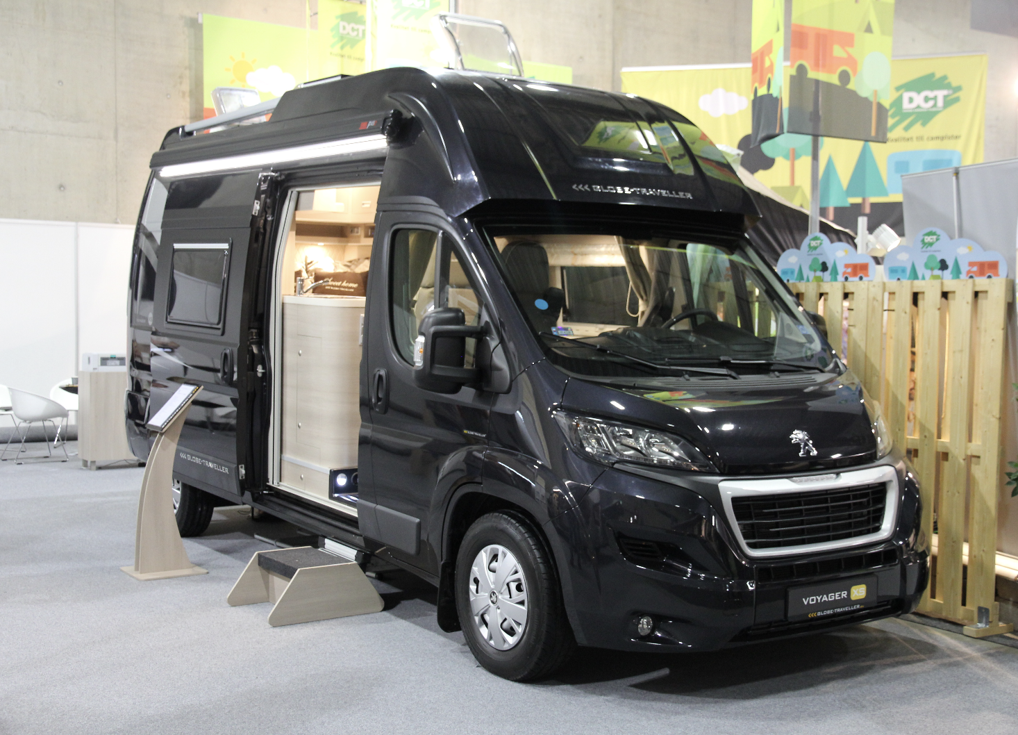Vi kikket litt nærmere på Globe-Traveller Voyager XS på Peugeot, som stod utstilt på messen. Prisen i Norge vil havne på 840 700 kr med metallic lakk, LED-lys, markise og tre 50W solcellepanel.