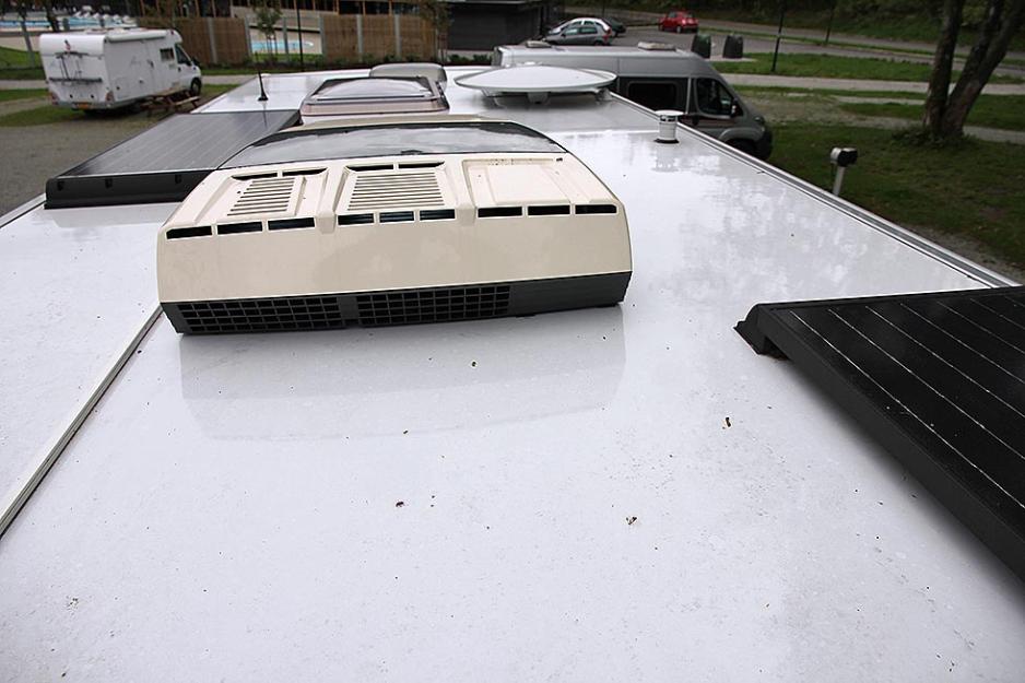 Taket fortjener et avsnitt for seg selv: I front er det en meget romslig, elektrisk senkeseng med leselys, hylle og takluke. Så kommer en spesielt stor takluke over sittegruppen. Denne gir mye lys i dette området. Ved kjøkkenet er det en normalt stor takluke. Her finner vi også Dometic Freshlight aircondition, som har glass og slipper inn lyset. Over den frittstående dobbeltsengen er det ytterligere en takluke. Utvendig er det plassert fire solcellepaneler på taket, her finner du også hovedenheten til airconditionen.