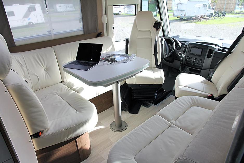 Jeg trives som best når jeg kan sitte og arbeide en stund i sittegruppen på den bobilen eller vogna vi tester. Her kjenner jeg den myke puten i ryggen, føler på teksturen i bordet og nyter utsikten gjennom den store frontruten. Modellen vi testet har hvitt skinn, som ikke er min personlige favoritt - men det ser selvsagt veldig lyst og pent ut.