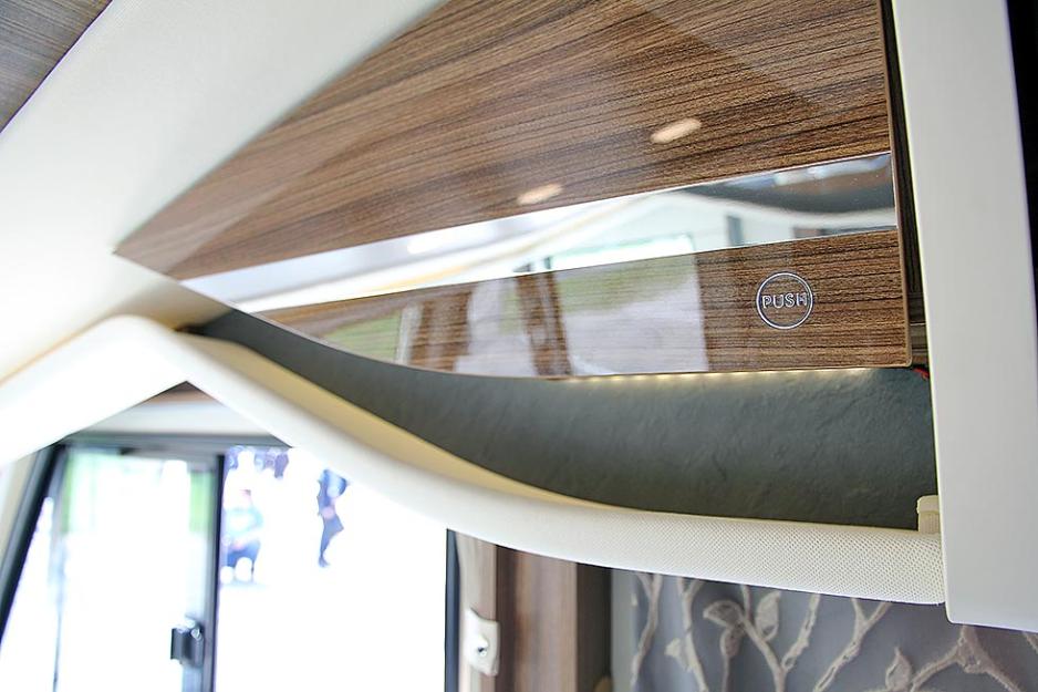 På prototypen var de kompakte sylinderne av noen frontlys bygget inn i en lekker svart ramme, men de to parallelle LED-lysene manglet ytre beskyttelse i form av glass. Noe vi regner med vil rettes opp på produksjonsmodellen, da snø og is ellers vil kunne dekke til lyktene. Det er innført et nytt designelement i glass med strå-motiv. Disse finner du på skyvedøren og i dusjen, og gardiner og puter har beslektet naturlig motiv. Når skyvedøren lukkes tennes det automtaisk lys i denne døren. Fiffig detalj. Dette er i det hele tatt en meget elegant og gjennomført veldesignet bobil.