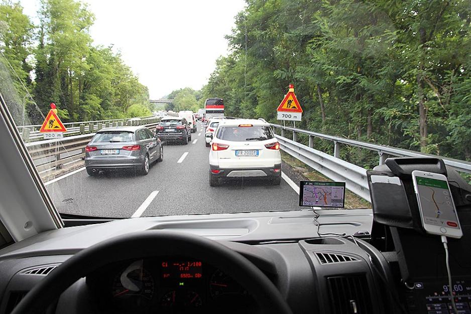 Viser vei: En av funksjonene på Garmin Camper er å varsle om trafikkproblemer. Denne informasjonen (ytterst på høyresiden i displayet) kan være veldig nyttig, men er ikke alltid til å stole på. Som i dette tilfellet i Toscana hvor det var stillestående kø.