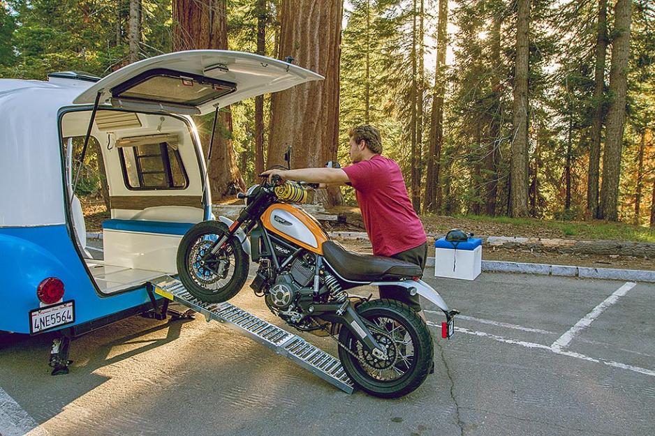 Vogna har en stor praktisk bakdør som gjør to ting: Den åpner for at den kompakte campingvogna kan frakte til dels store gjenstander. Lasterampe selges som tilbehør, her er det muligheter for å få med seg en motorsykkel.