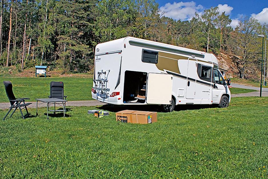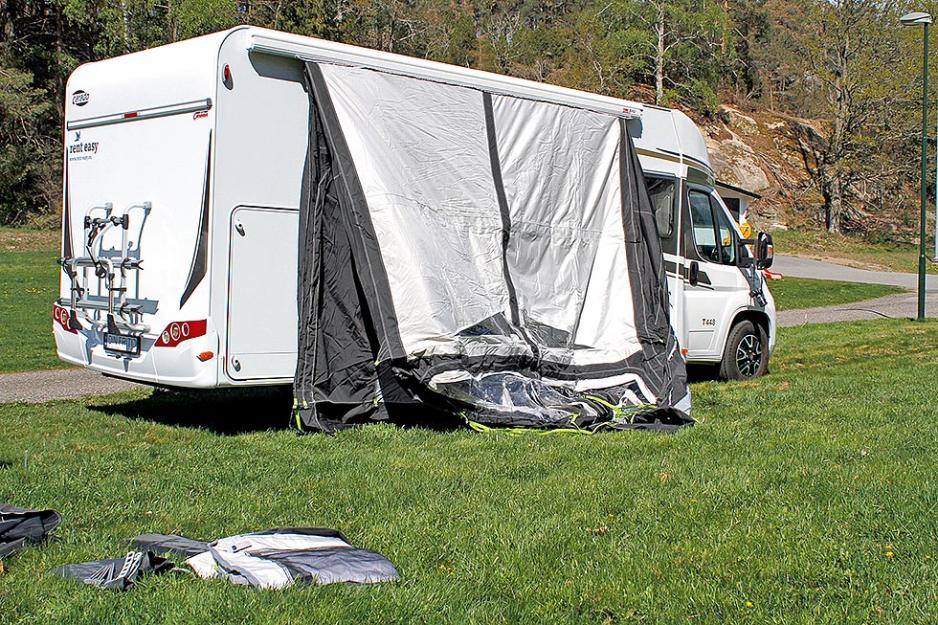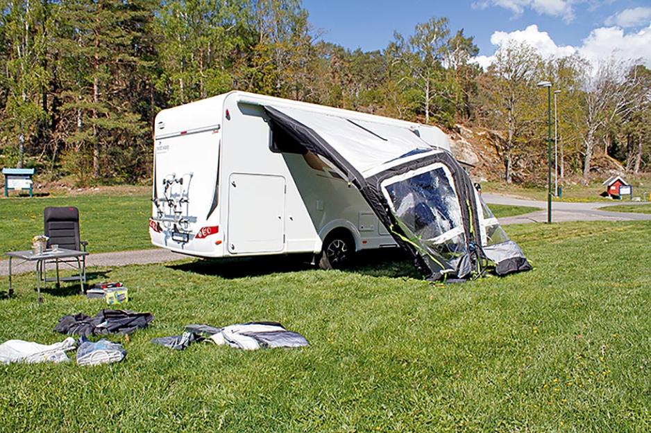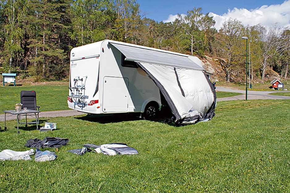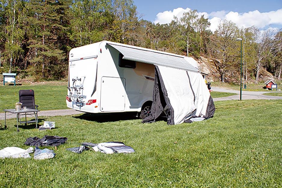 På Røstad Camping denne dagen er gresset er grønt og solen skinner, men det blåser og vinden er sur. En typisk dag hvor man går eller sykler seg en tur og så kryper inn i bobilen igjen. Men det trenger ikke være slik, vi har nemlig med oss et «ekstrarom» i garasjen. Med dette fortelt kan du glede deg over varmen fra sola, uten å plages med den sure vinden.
