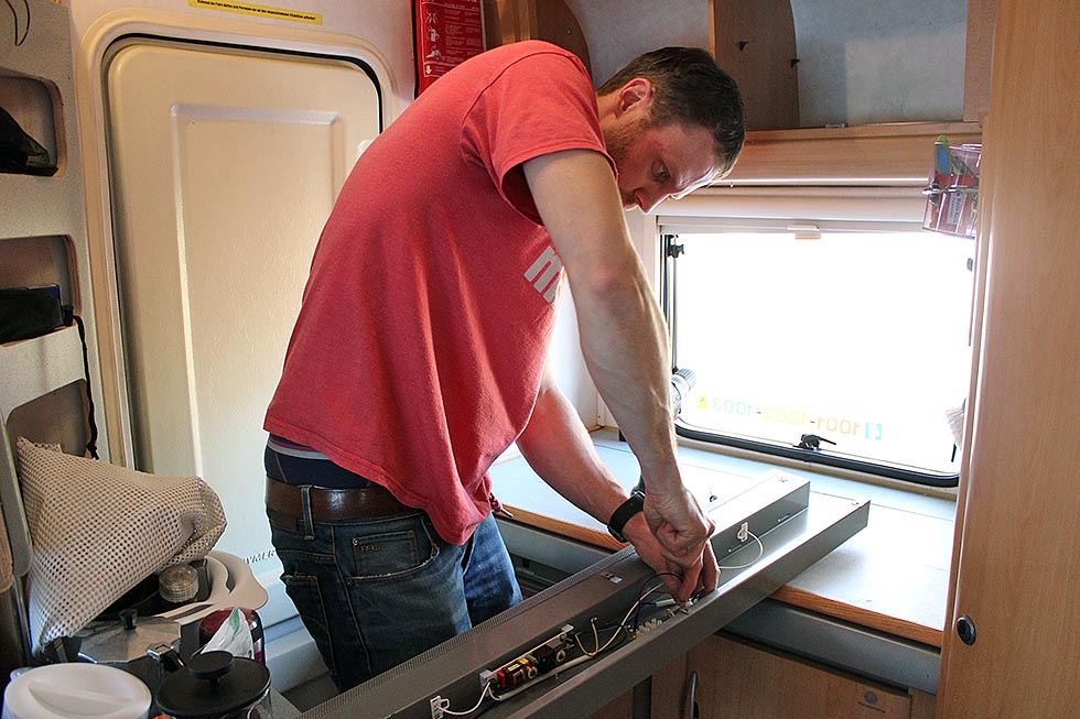 Spottene i bilen har fått nye LED-pærer. Det var enkelt å bytte ut de gamle halogenpærene. Over kjøkkenbenken har Hymer i sin tid spandert en stor armatur i kjøkkenets fulle bredde med 20 W lysstoffrør og 230 V stikkontakt. Denne var såpass integrert i overskapet at vi lot den bli værende - det var tilstrekkelig å montere en flat LED-armatur på undersiden. Den var på 5 W.
