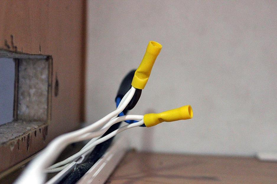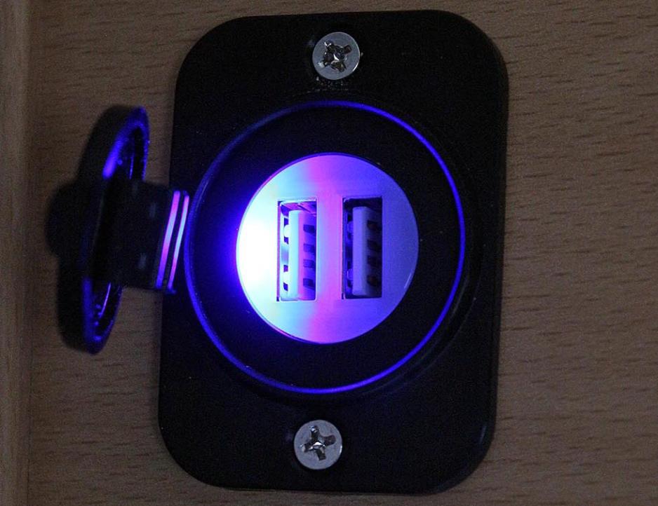 Videre monterte vi en dobbel USB-kontakt for lading av mobil og nettbrett. Den ble plassert fremst i overskapet på høyre side i bilen. Da kan mobilen benyttes fra sittegruppen og alkoven mens den lades. Med riktig hullsag var monteringen enkel. Rett på innsiden lå ledningene til belysningen på undersiden av overskapet, så her var det bare å kople seg på.