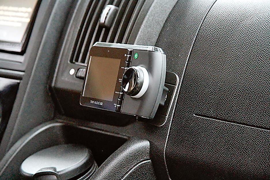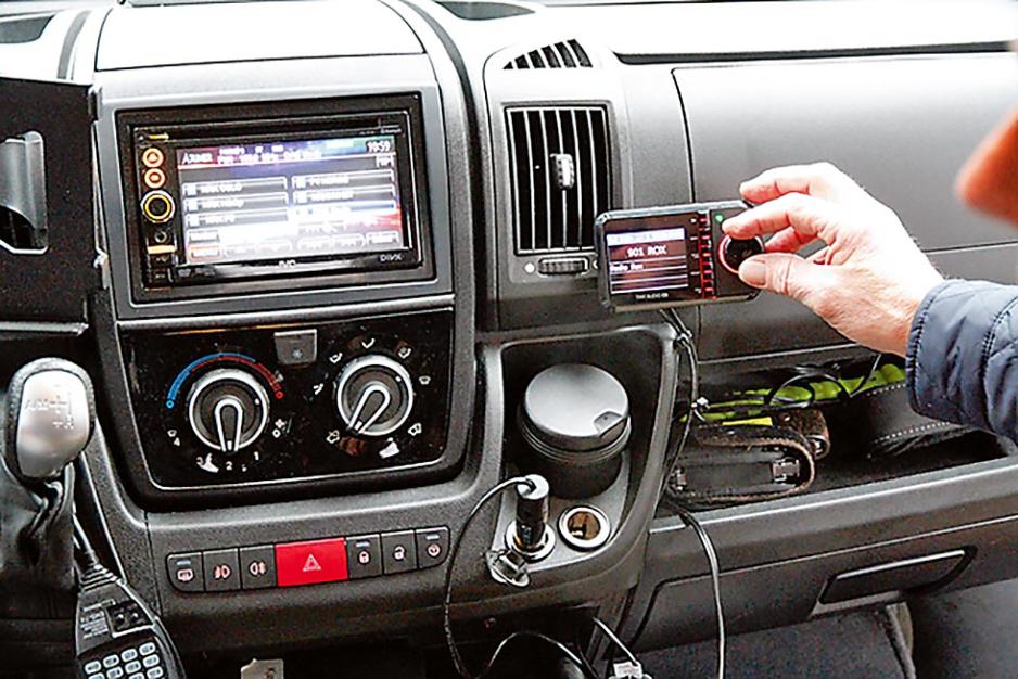 Det første vi legger merke til på bybobilen er dens høye ståltak, som vil påvirkeantennens mottak. Neste utfordring er alt utstyret i førerhuset: UHF Bobilradio, holderfor nettbrett, dashbord-kamera med mer. Det blir litt diskusjoner om plassering av DAB-adapteret, som ikke er opplagt. Kanalvalget vil skje på adapteret, og informasjon omvalgt kanal vises også på dette displayet. Adapteret må derfor være innen rekkevidde for føreren. Det er to fysiske ledninger man må ha til et slikt ”tradisjonelt” adapter som vi skal montere: Strøm og antennesignaler. I tillegg kan man velge å koble til eksisterendelydanlegg med en AUX-kabel, men kan også gjøre dette trådløst via FM-båndet.