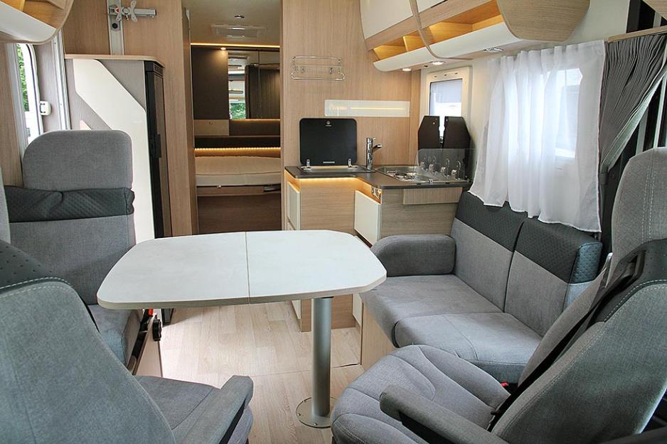Sittegruppen består av to sidesittere som kan gjøres om til to sitteplasser under kjøring. Itineo og flere andre har fått en ekstra utfordring i fanget, nemlig plassering av AdBlue-påfyllingen. Dette var ikke løst på prototypen, men den er nå plassert innvendig, rett ved førersetet. Det er ingen tvil om at man vil ha denne påfyllingen på utsiden av bobilen, så denne løsningen stiller vi oss heller tvilende til.