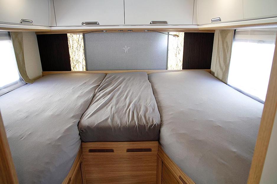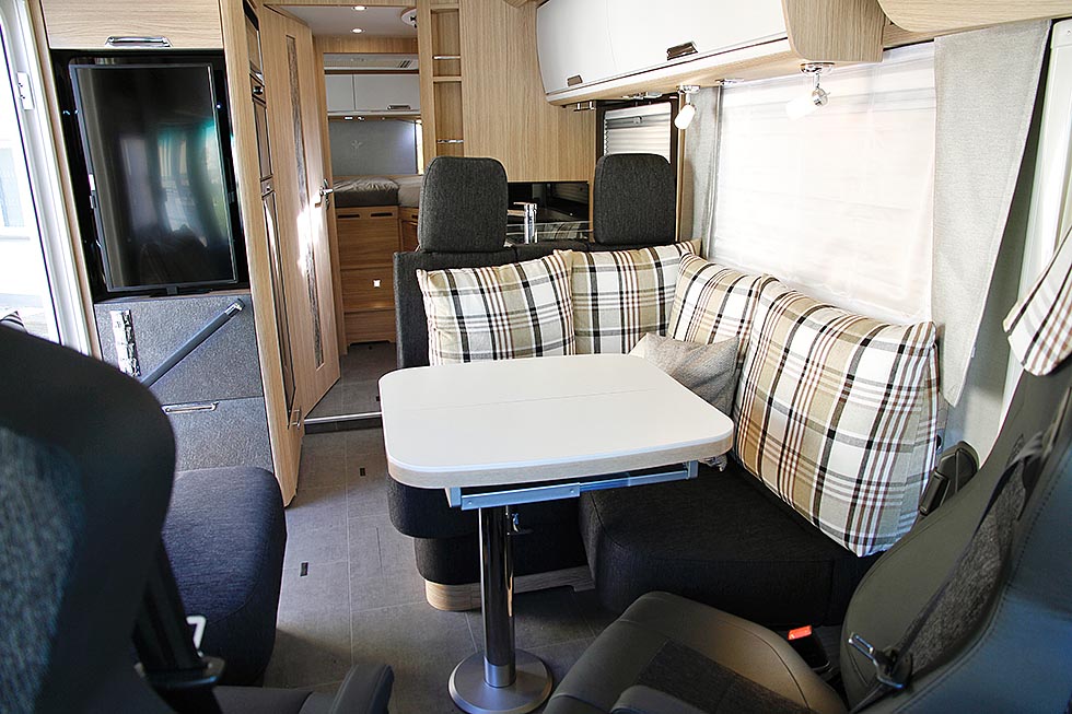 Boppard, Tyskland: Arto 82 E har tandemaksel og bedre plass, som brukes til et ekstra garderobeskap. Badet er også noe større, og bordet i sittegruppen er nytt og uttrekkbart. En ny, massiv skyvedør kan brukes til å skille av soverommet. Det blir plass til større TV i kommende sesongs Niesmann-modeller: 32" i Arto og 40" i Flair. Produsenten har fokus på detaljene og jobber med å inkludere flere skjulte resonanshøyttalere i bobilene. Modellen Arto 82 E kan leveres enten med tradisjonell sittegruppe eller med sidesittere.