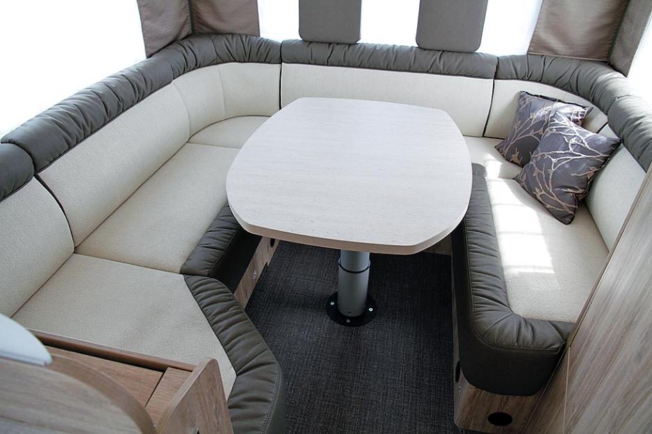 Den tredje nyheten er Profila RS 720 QF. Frittstående dobbeltseng og sidesittere i kombinasjon med et lyst og trivelig interiør.