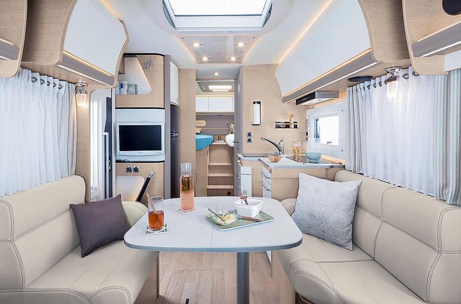 Bybobilen Rapido V62 er en spennende modell med en utradisjonell fransk sengeløsning. Vi kommer tilbake til denne modellen senere. En annen kreativ sengeløsning finner man på integrerte 856F og halvintegrerte 656F: En variant på fransk seng, men med adkomst til sengen også fra veggsiden.