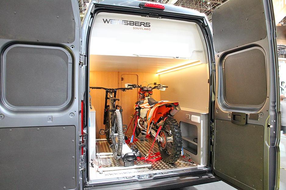 Weinsberg Outlaw CaraBus 630MEG er det offisielle navnet på markedetds første salgsklare bybobil med en skikkelig garasje. Halve bybobilen (i front) har en tradisjonell løsning, med to svingbare forseter, bord og bakseter. Så er det kjøkken og motstående bad. Alt som normalt, med unntak av overskapene som er høyere enn normalt på grunn av den ekstra takhøyden (282 cm), men ellers ser alt kjent ut.