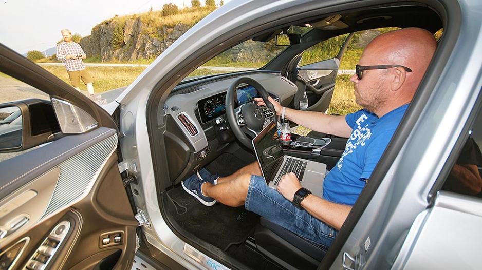 EQC-en hadde heller ingen særlige problemer, selv om restkapasiteten i batteriet (80 kWh utnyttbart) var magre åtte kilometer. For å komme inn til hurtigladeren, måtte vi koble fra vogna. Det er en av få utfordringer med EQC som trekkvogn: Den har ladeporten på høyre bakskjerm.