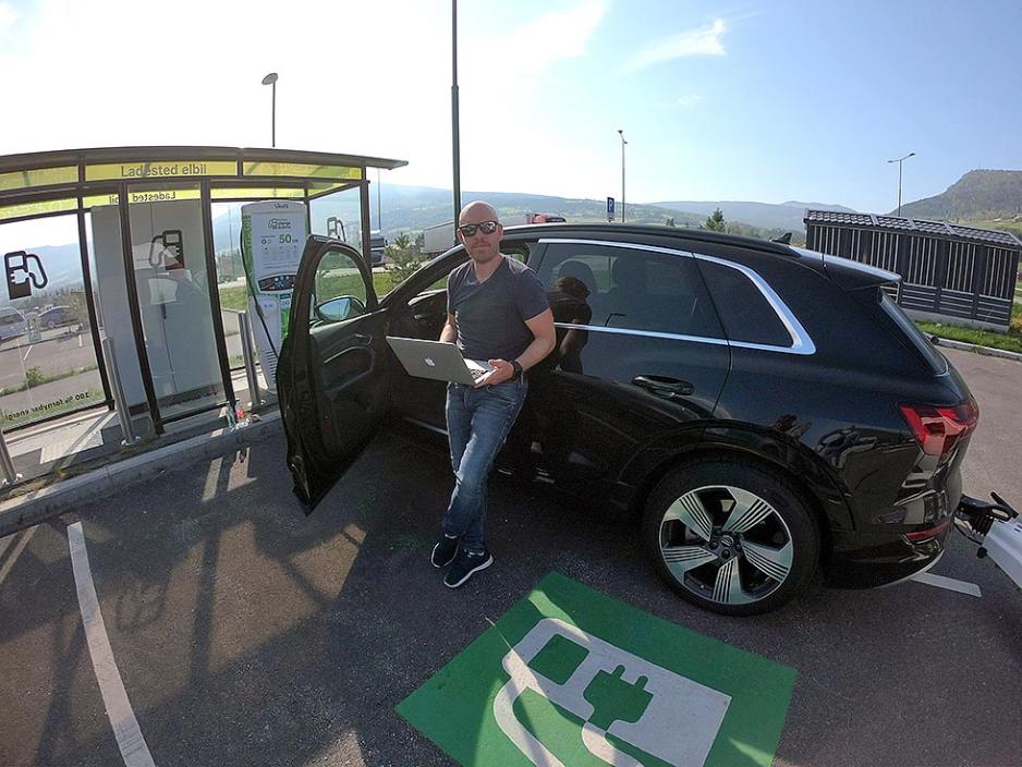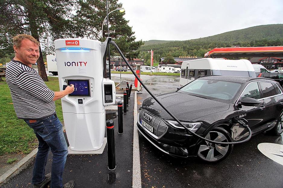 En av dagene startet på Dønfoss camping klokka 07.15, med kurs mot hurtigladestasjonen på Grotli og en kjapp frokost. Audien hadde nektet å lade på gamlemåten, via campingplassens husholdningskontakt, og måtte ha påfyll. Indikatoren på ladekabelen lyste rødt kvelden før, og viste at bilen ikke var fornøyd med kvaliteten på jordingen. Nullstilling var nytteløst.