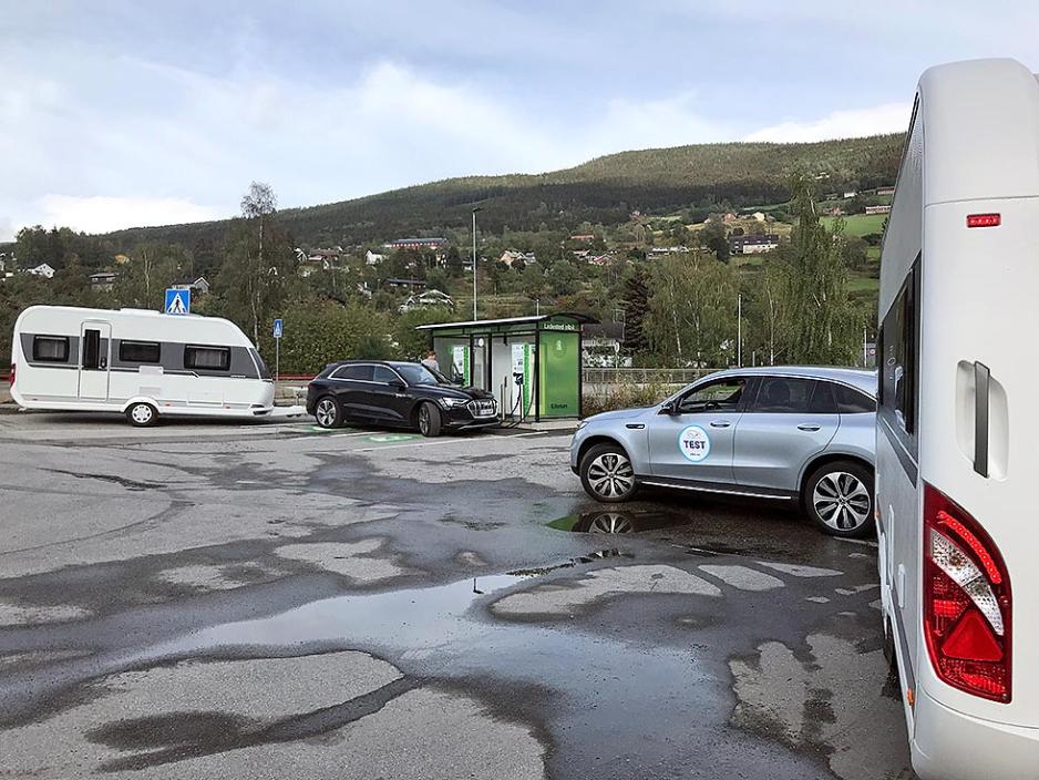 Ennå er det ikke vanlig at elbiler med campingvogner kommer i flokk og følge, men i Vinstra vegpark hadde det vært kjekt med ordentlig raske ladepunkter. Alt som finnes her – utenom Teslas superladestasjon – er 50 kW-ladere i regi av Fortum og Grønn Kontakt. En slik stasjon trenger mer for å håndtere behovet vi hadde i denne testen. Lynladere hadde vært perfekt, og det er opplagt at denne lokasjonen må ha et antall slike på kort sikt. Heldigvis var det lite trafikk på Teslas superladere, slik at vi kunne parkere sideveis med vår Model X og oppta fem ladeplasser. Det anbefales mildt sagt ikke når det «koker» på alle uttak, og det hadde heller ikke vært mulig å snu med vogna om vi ikke hadde hatt området nesten for oss selv. Rygging hadde vært eneste løsning.