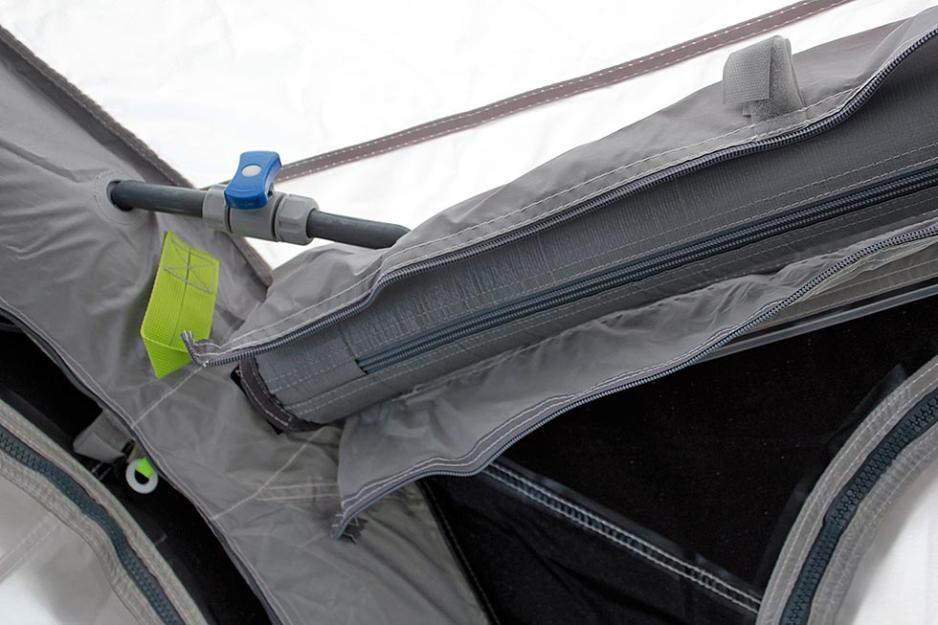 Det er to grunner til at det går veldig raskt å sette opp dette forteltet. Det er overhodet ingen løse deler. Hele teltet henger sammen, og det betyr at du ikke trenger å lete etter en eneste stang. I kombinasjon med kun ett punkt å koble til pumpen går det raskt å få luft i absolutt alle stengene.