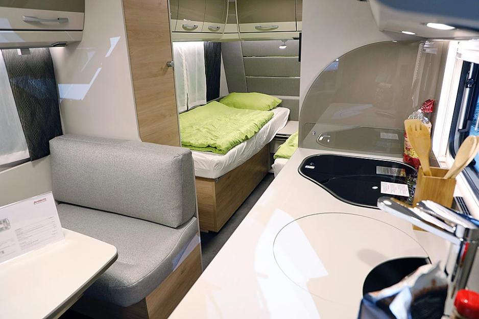 Det er fremkommelighet som står i sentrum hos den tyske bybobilspesialisten Karmann Mobil: På CMT hadde de fokus på modeller basert på Ford Transit med firehjulstrekk. Vi har tidligere skrevet om Dexter 560 4x4 med tverrstilt dobbeltseng. Nå kommer splitter nye Dexter 570 AW med langsgående senger og en lengde på kun 5,98 meter. Det klarer produsenten å oppnå ved å kutte ut baksetet. I stedet får man et bord og ganske god romfølelse når man har parkert og snur forsetene.