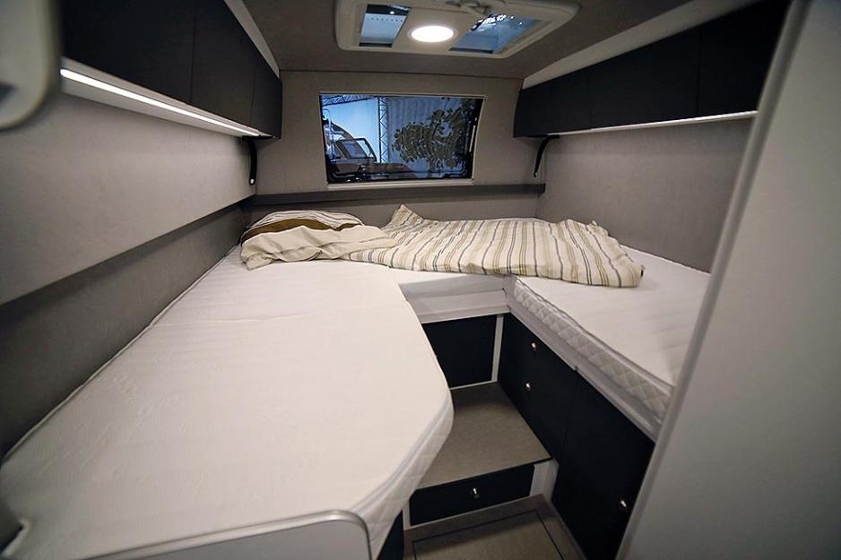 Med en lengde på kun 5,99 meter har Knaus klart å få til en ganske så god sengeløsning på Boxstar. Takket være det høye taket er det plass til å trekke frem en ekstra seng oppunder taket. Det gir fire soveplasser i en kompakt bybobil. På bildet ser vi Knaus Boxstar 600 Street XL.