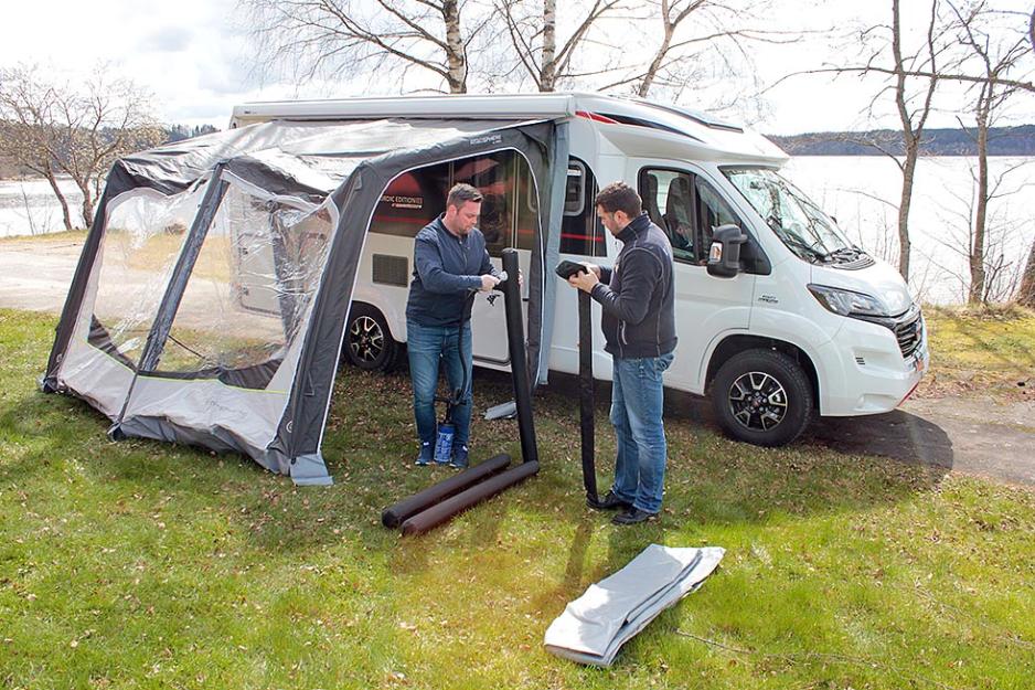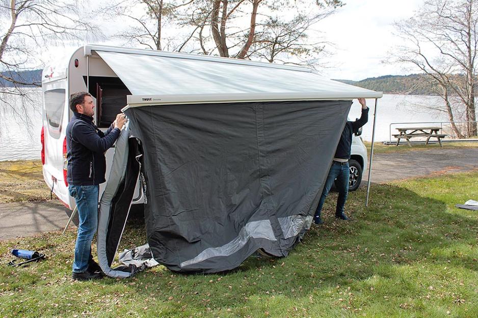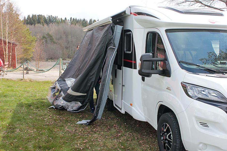 Vær klar over at de løse luftstengene bygger ganske mye. På vår testbil, en Bürstner Nordic, så var det litt for liten avstand mellom markisen og døren. Det gjorde at det ikke ble plass til å åpne og lukke døren. Av erfaring vet vi at det er mange ulike plasseringer og løsninger for markisen, derfor anbefaler vi at du monterer forteltet før du kjøper det. Det er også greit å være klar over at som regel går en av sidene på forteltet over et vindu på bilen eller vogna. For det første er det da umulig å få en rett og tett avslutning mot veggen, om du har et utenpåliggende campingvindu.