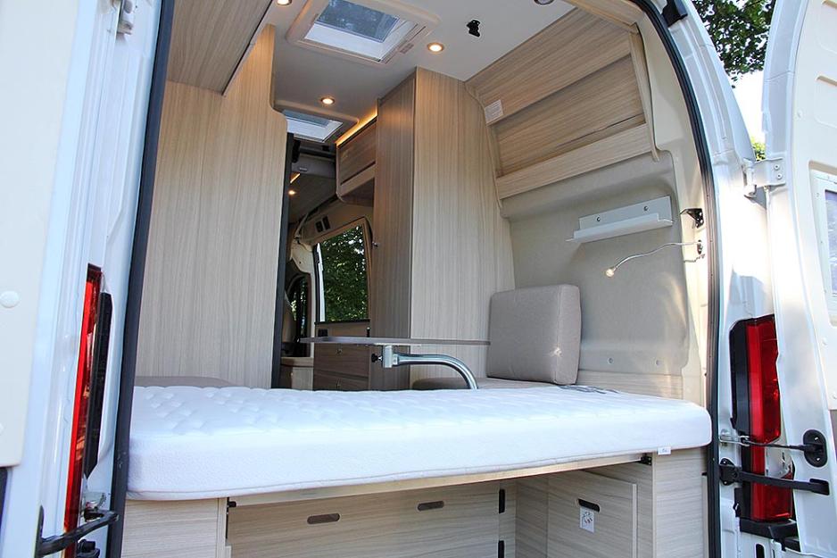 Når man åpner skyvedøren ser man i utgangspunktet ikke noe spesielt. En tradisjonell sittegruppe, med bad og kjøkken plassert på klassisk vis. Løfter du blikket vil du se at her er det en langsgående senkeseng med bredde 130 cm. Sidesitteren er litt større enn normalt, og det har sin enkle forklaring: Den rommer nemlig stolen til den femte sitteplassen. Badet og kjøkkenet er parallelt plassert overfor hverandre, og tilsvarende er det høye (!) kjøleskapet og et romslig høyskap.