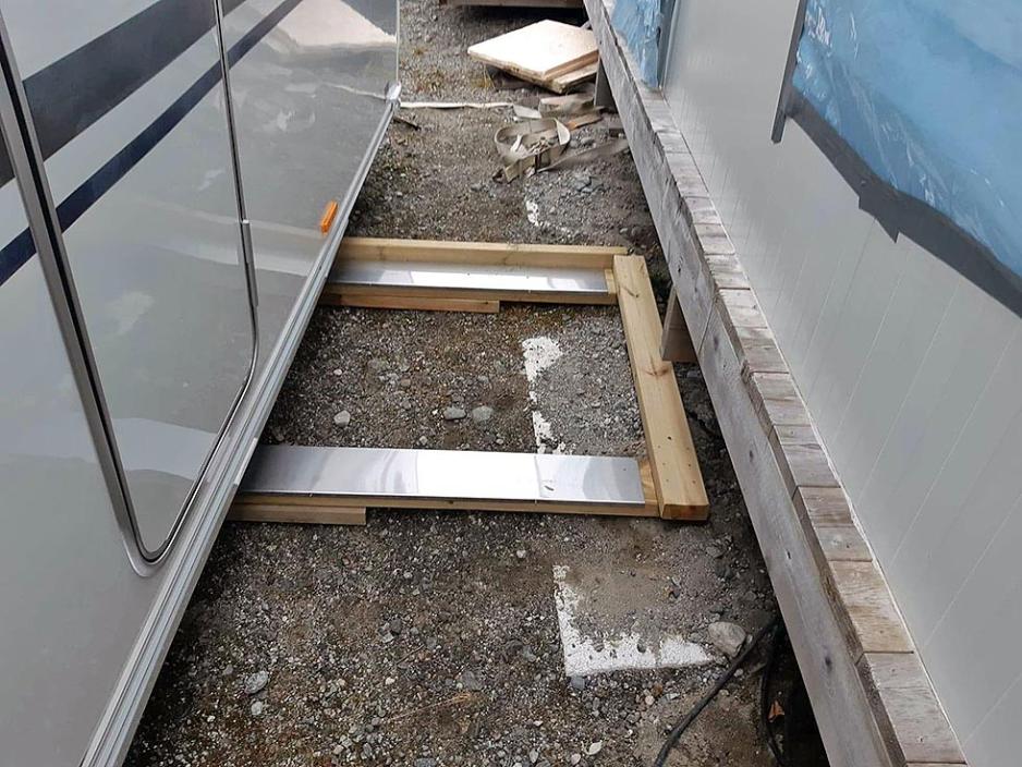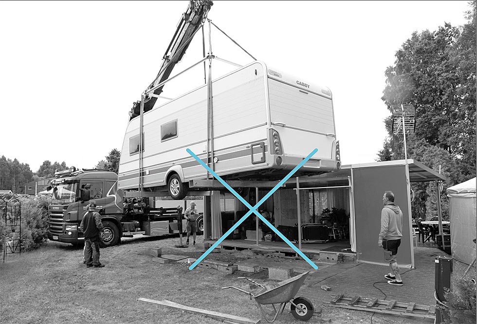 Alternativet er en såkalt caravanrulle eller en slider. Med denne kan du kjøre vogna sideveis ved hjelp av en drill. Da må du ha plassert vognhjulene på skinna og forberedt nesehjulet ved å vri det riktig vei. Legg gjerne under en plankebit også. De fleste systemene som finnes på markedet baserer seg på en gjengestav som man skrur med en drill, og hele vogna flytter seg sideveis.