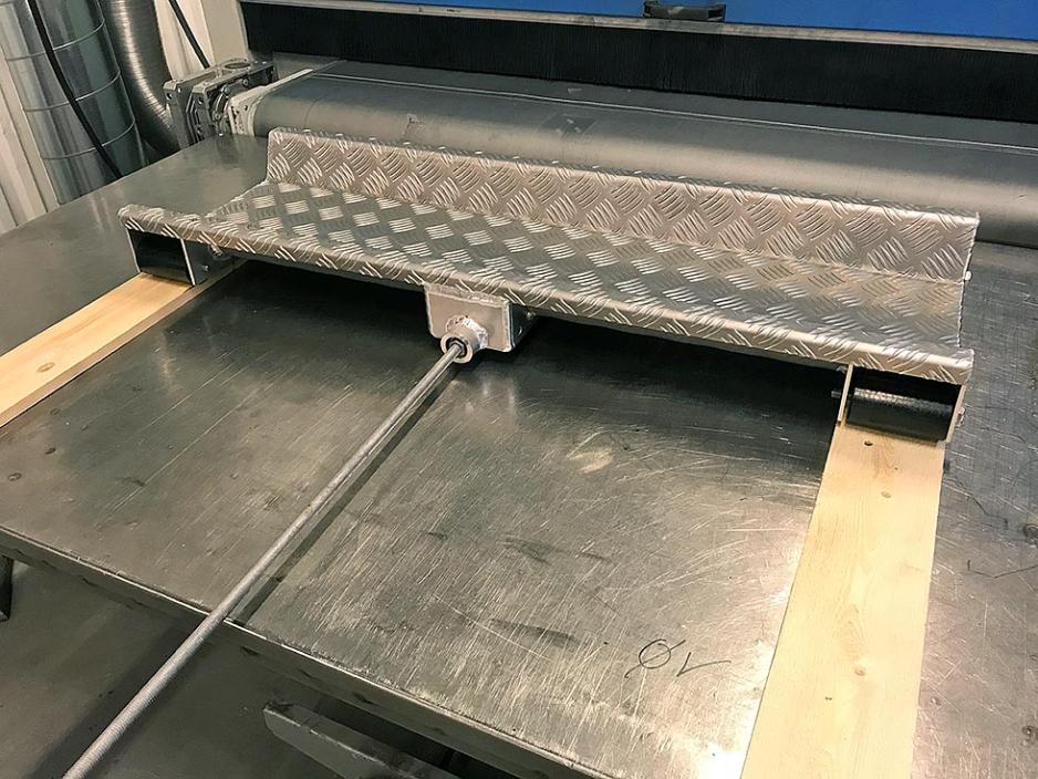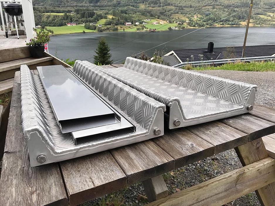 – Midt mellom rullene er en knekt profil montert som har en påsveiset gjengehylse og et M12 gjengestag. Staget trekker vognen mot forteltet. Løsningen gjør at du får satt litt press på pakningen/kontakten inn mot forteltet, så det holder seg tett. Standardmålene er 1000mm x 230mm på rullen, noe som passer til både enkelt- og dobbeltakslede vogner. Produsenten lager også andre dimensjoner på bestilling.