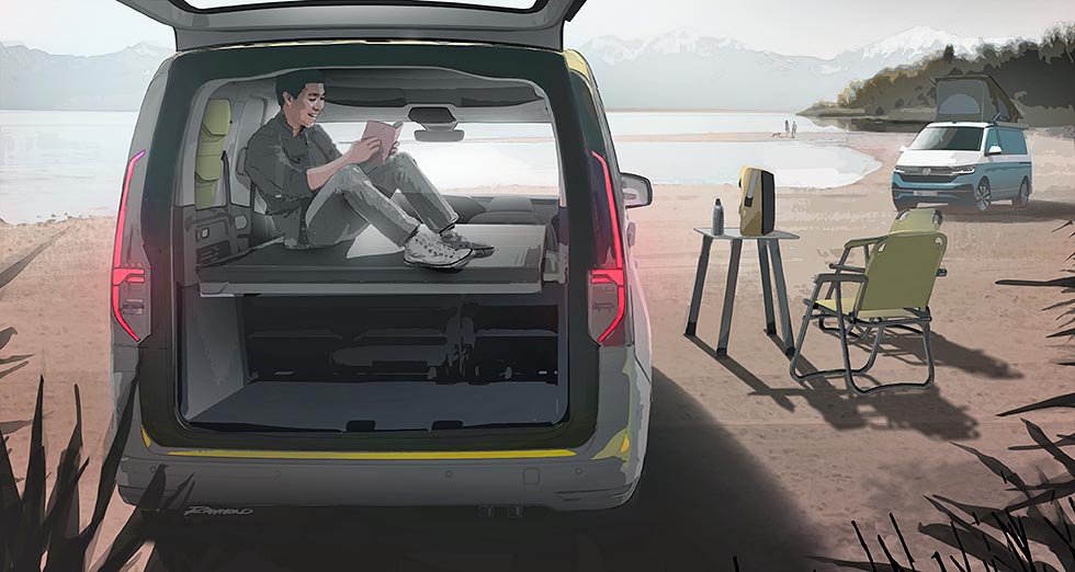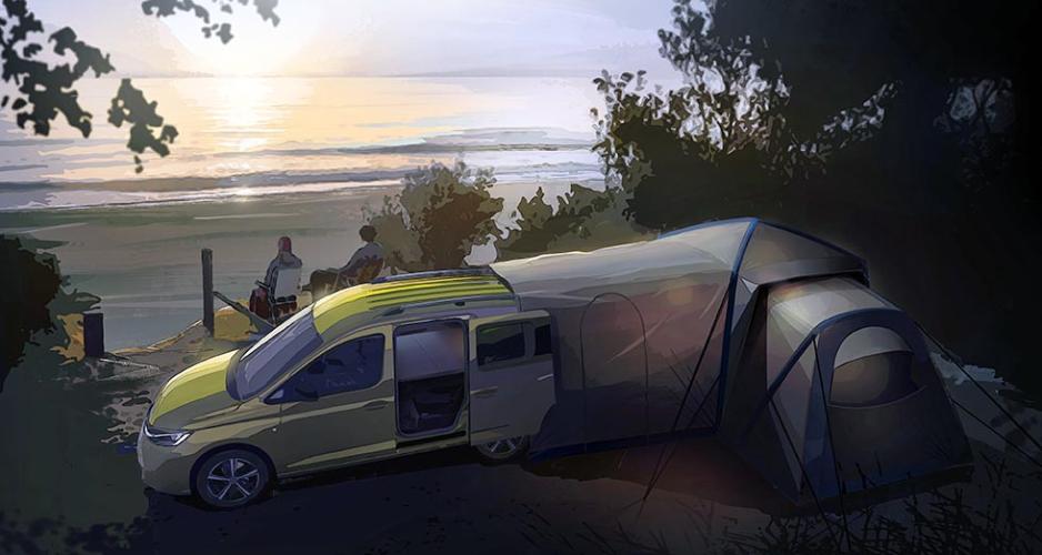 Volkswagen Caddy selges mest i Norge som varebil for to personer, og det er denne som Nyttekjøretøyavdelingen hos den tyske bilprodusenten bruker som utgangspunkt. Ombord finnes blant annet campingmøbler hentet fra VWs campingbil California.