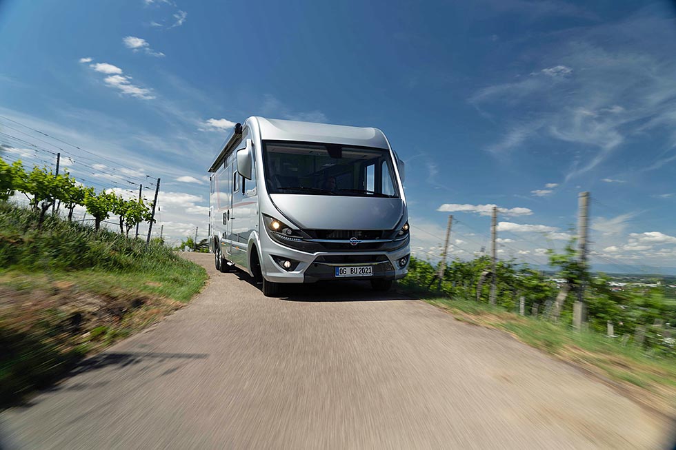 Med Mercedes´ forhjulsdrevne Sprinter-chassis og Hymer-gruppens SLC-chassis som base, står modellen støtt på en moderne plattform. Stuen er preget av moderne interiørdesign i fargene hvitt, beige og svart. Bobilen har mye utstyr, blant annet magnetglassene vi fikk se i flere av Bürstners modeller i fjor. Både krystallglass og plastkopper av høy kvalitet kan festes til flere overflatetyper ved hjelp av ulike magneter. Lagringssystemet gjør at glassene ikke klirrer eller ramler overende, og er et flott blikkfang.