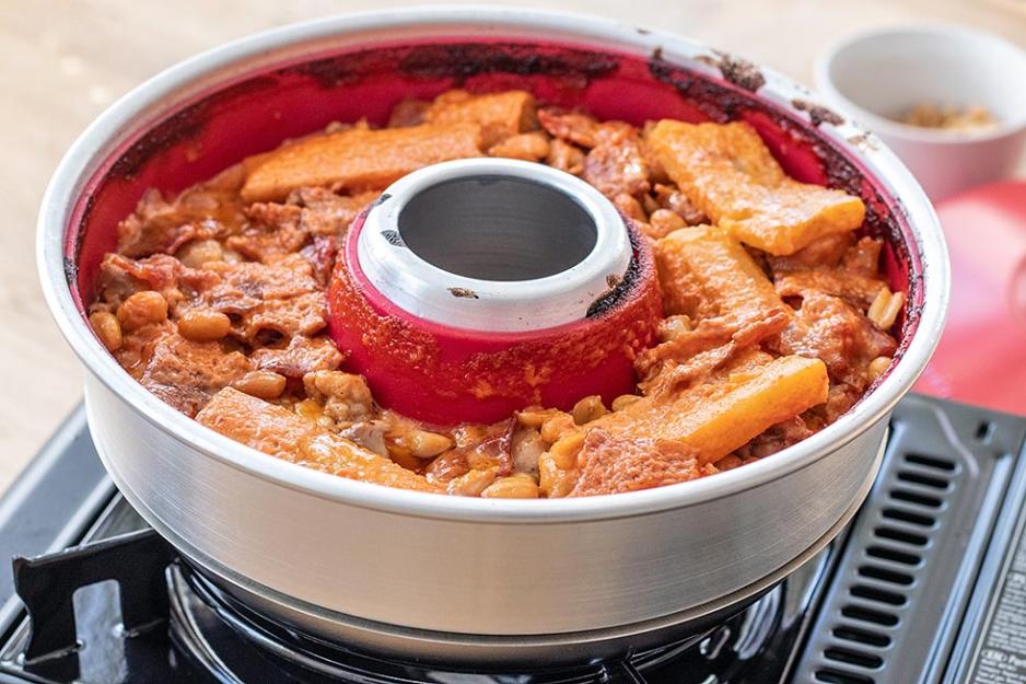 - Smør formen. Legg kyllingen i bunnen av formen. Skjær opp baconet, legg det på kyllingen, men spar litt til garnityr. Legg på bananskiver og dryss over peanøtter.