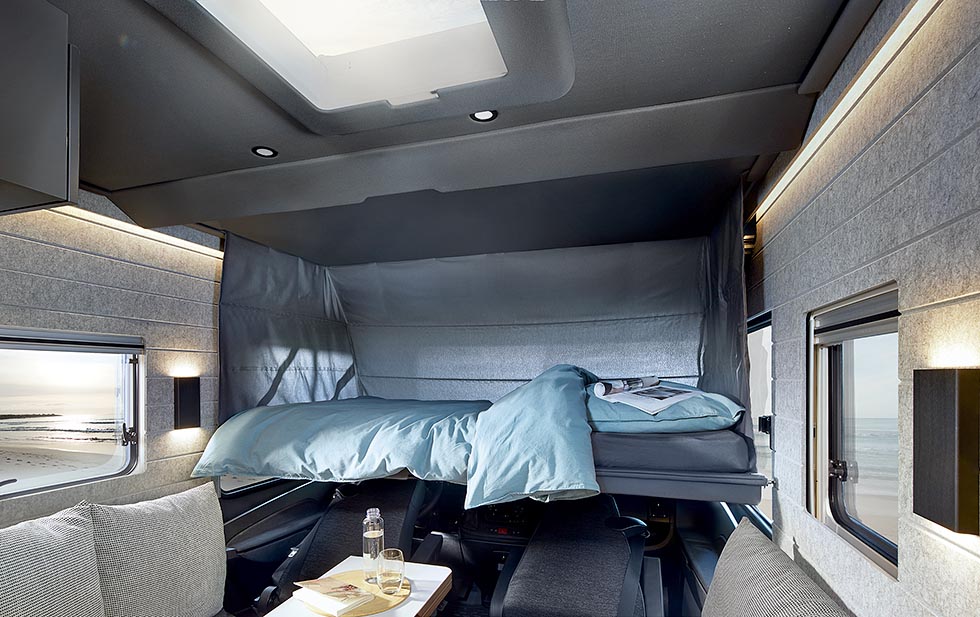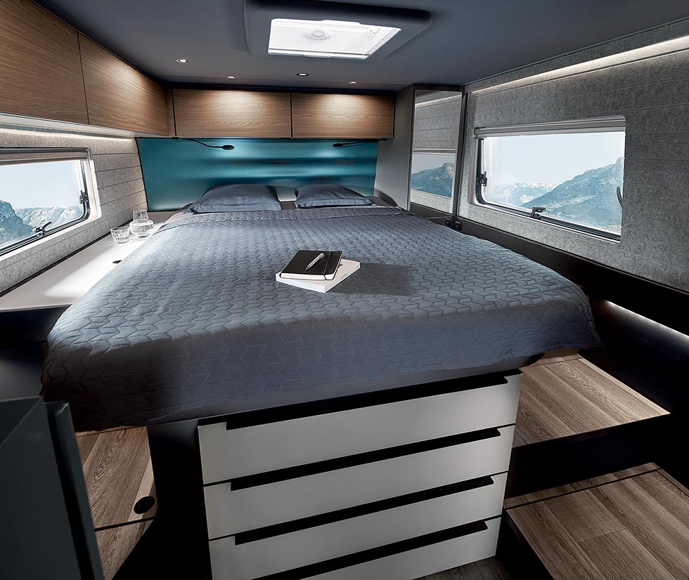 Det tilbys én modell med dobbeltseng (140x200cm) og én med to høye enkeltsenger. Sistnevnte kan man re opp til en bred dobbeltseng. I front er det en senkeseng som går helt frem til frontvinduet. Den er uvanlig pent integrert i taket, og frontplasseringen gir god utnyttelse av plassen.