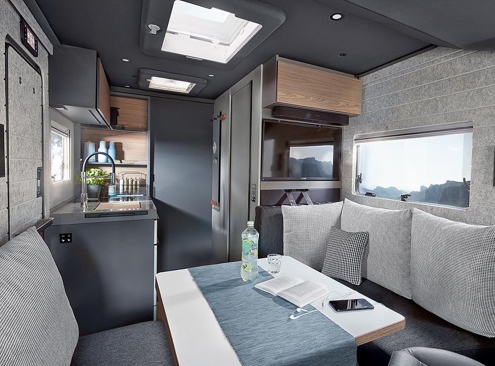 Kjøkkenet har et unikt, elektrisk drevet heveskap, eller kanskje mer korrekt: En hevehylle. Mens du kjører senkes denne ned i kjøkkenbenken, noe som gir god romfølelse innvendig i bobilen. Når du ønsker fred og ro på soverommet kan hyllen heves og en skyvedør trekkes inntil, slik at du plutselig har et helt separat soverom.