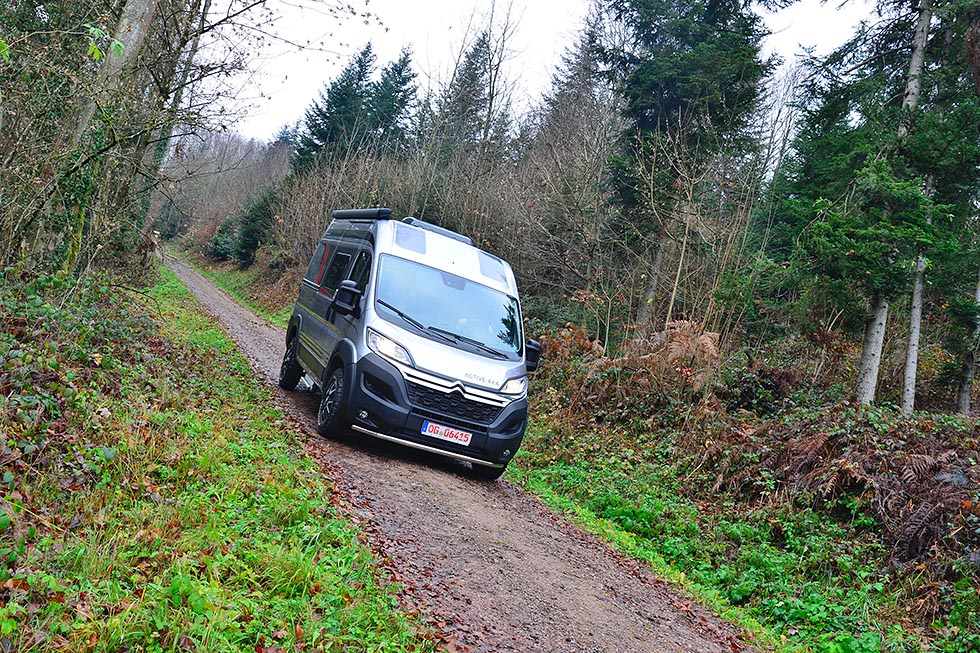 Vi prøvde å provosere modellen ved å stå med høyre sidehjul på asfalt og venstre sidehjul på leire, og så sette bilen i bevegelse. Det gikk helt udramatisk. Vi fant en gjørmete skogsvei, hvor vi kjørte opp og ned, frem og tilbake, men for en bobil med firehjulsdrift var det ingen utfordring.