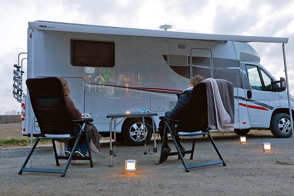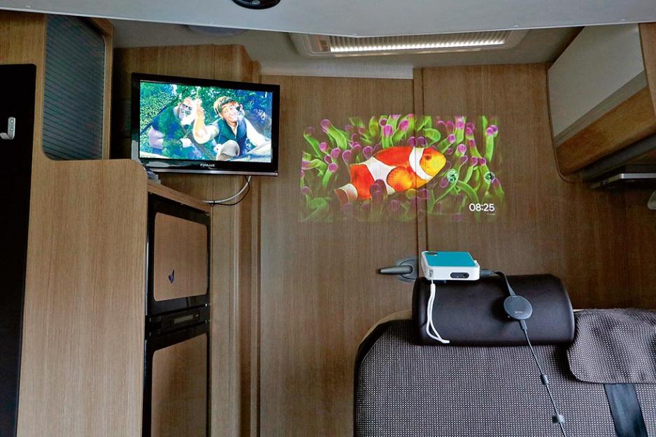Innendørs kan vi effektivt mørklegge bobilen, selv midt på dagen. Det gjør at projektoren fint kan konkurrere med TV-en. Med et fastmontert hurtigfeste eller to, kan man bare rigge seg til i godstolen.