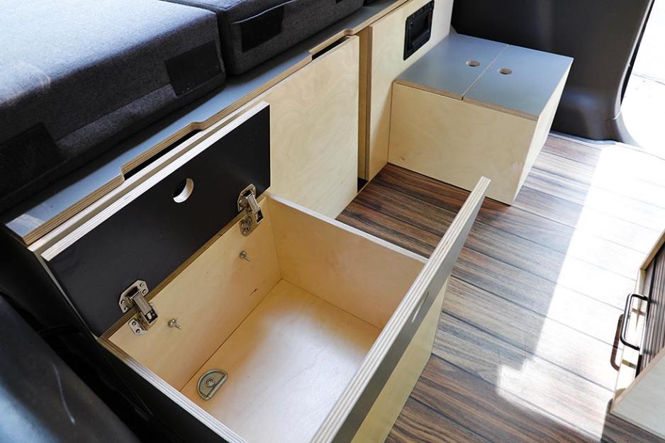 Dermed gjelder det å tenke kreativt og se flerbruksmuligheter av det samme arealet. For når sengen er redd opp er det rett og slett ikke mer innvendig plass. Da skal det sies at under sengen er det plassert en kjøleboks, et løst dobbelt kokebluss, en vask med vanntank, pumpe og gråvannstank. Og det er noe lagringsplass her.