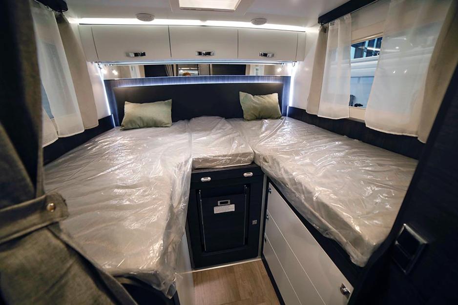Det er god lagringsplass i den romslige garasjen, takket være de relativt høye sengene. At Benimar har klart å få plass til enkeltsenger i denne modellen på «kun» sju meter er imponerende. Spesielt når man tenker på at det er separat dusj i bobilen.