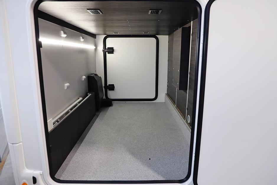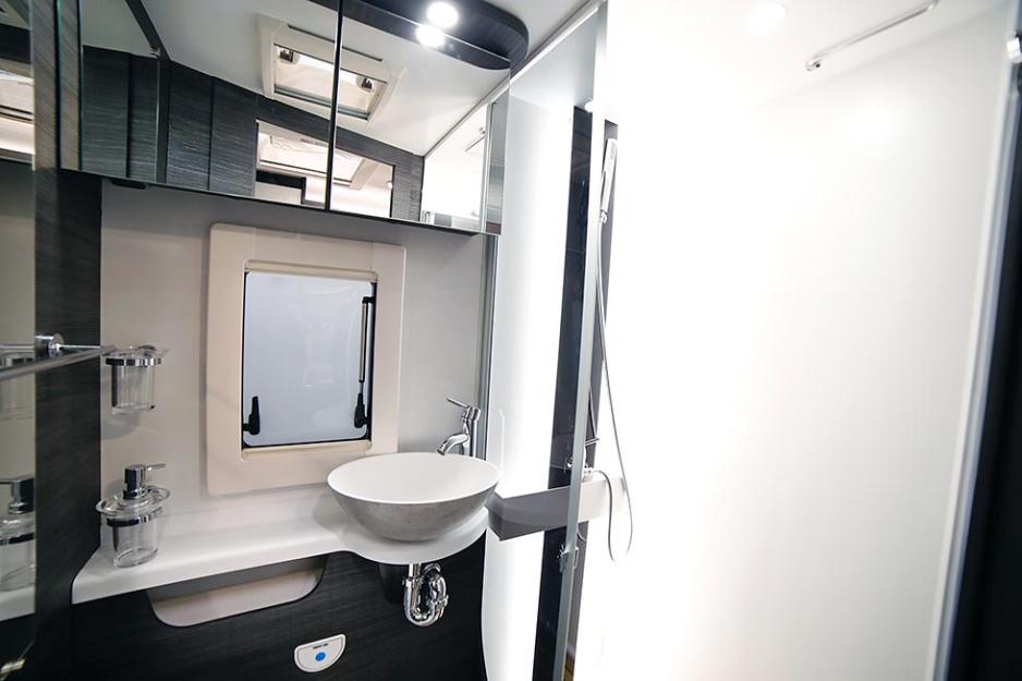 Badet på denne modellen kunne vært brukt som eksempel på hvor stilig det går an å designe et lite bobilbad. En ting er at det har hva man kan forvente av praktiske funksjoner og lagringsplass, inkludert luftevindu og takluke. Men lyssettingen og detaljene, spesielt på den separate dusjen, er meget delikate. Dusjhodet ser skikkelig stilig ut, og rommet nærmest bader i lys. Trykkvannsystem med Shurflo-pumpe er en kvalitetsløsning.